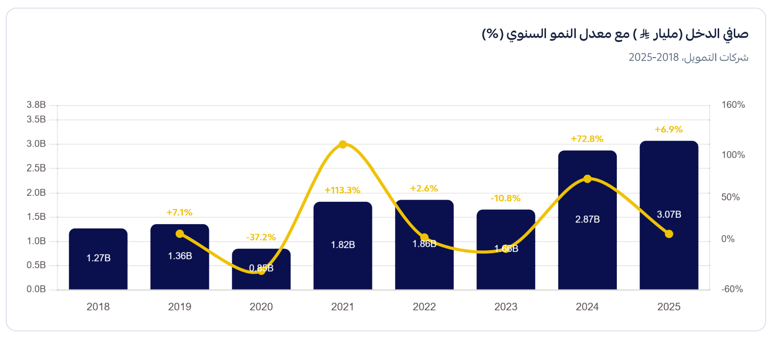 حققت شركات التمويل صافي دخل قياسي بلغ 3.07 مليار ريال في 2025، بعائد على الأصول 4.16% وعائد على حقوق الملكية 9.87%، وهي مستويات كانت قبل فترة بسيطة بعيدة المنال لكن هذا يعتبر طبيعيًا مع اعتبار المملكة العربية السعودية من أقل البلدان عالميًا من حيث تعثرات القروض وتتوقع S&P Global أن تكون بين 1.6%-1.7% فقط في عام 2026.