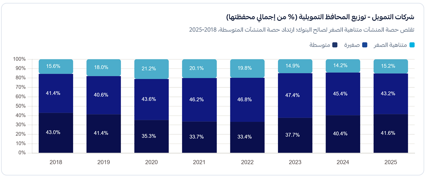 عمومًا، الأهم من ذلك هو التحول في توزيع المحافظ، ففي عام 2018 كانت المنشآت متناهية الصغر لا تمثل سوى 3.7% من محفظة البنوك، لترتفع إلى 17.9% في 2025. وفي المقابل، تراجعت حصة المنشآت المتوسطة من 74.2% إلى أقل من 50% للمرة الأولى. هذا التوسع نحو القاعدة يعني أن البنوك بدأت تنافس شركات التمويل في توجهاتها، ما يوجب على شركات التمويل إعادة التموضع أو المخاطرة بحلول أكثر وتوجهات جديدة مثل استغلال شريحة المنشآت المتوسطة التي انخفض دعمها من البنوك 💰