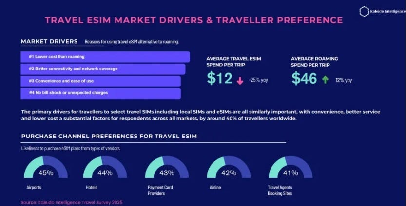 الحقيقة أن السبب الرئيس هو السفر، فبحسب استطلاع أجرته GSMA يعتمد 51% من مستخدمي الشريحة الإلكترونية التقنية لأغراض السفر، وذلك لكونها حلًا أمنًا وتكلفتها منخفضة مقارنة بخدمات التجوال التقليدية ؛ لأن متوسط إنفاق المسافر على الشريحة الإلكترونية عالميًا حوالي 12 دولارًا ، بينما يصل متوسط الإنفاق على التجوال التقليدي إلى 46 دولارًا للرحلة الواحدة! ✈️