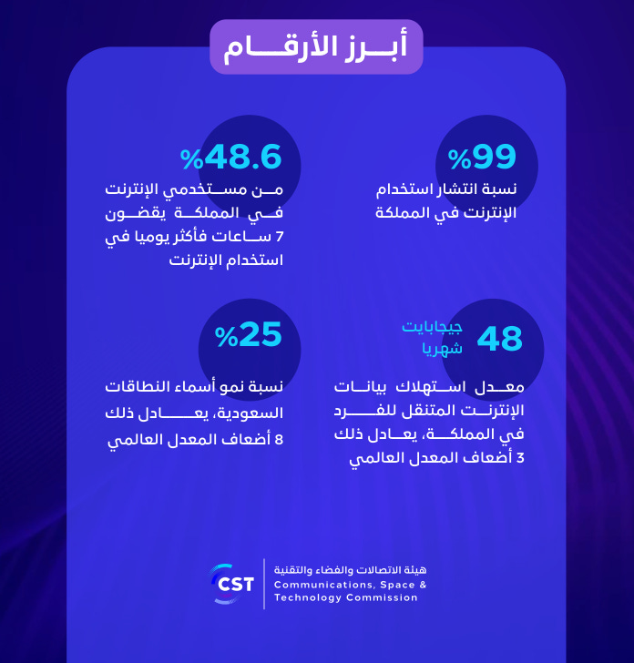 بحسب الأرقام الصادرة من هيئة الاتصالات والفضاء والتقنية، فإن 48.6% من المستخدمين يقضون 7 ساعات أو أكثر يوميًا على الإنترنت وخصوصًا بين 9-11 مساءً وهي الفترة التي تُمثل وقت الذروة للاستخدام، ويصل متوسط استهلاك الفرد منهم للبيانات كل شهر بنحو 48 غيغابايت، وهو ما يعادل 3 أضعاف المتوسط العالمي 🌎