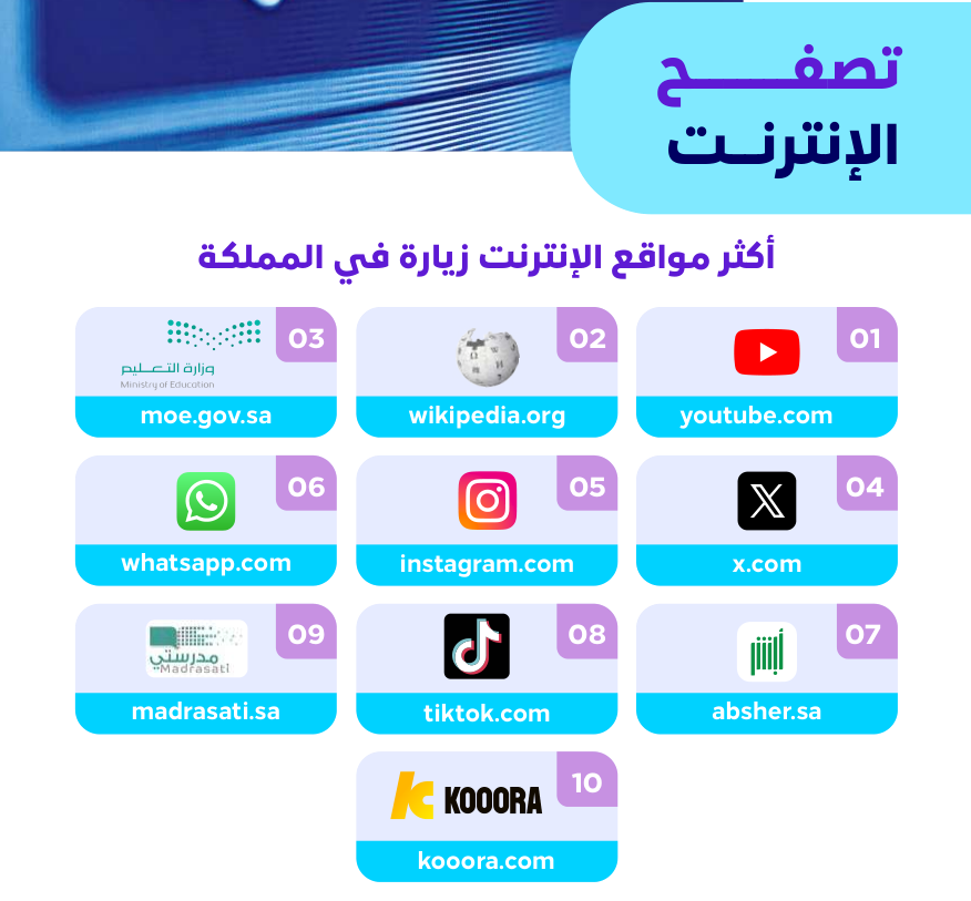 أما عن المواقع الأكثر استخدامًا فيعتبر محرك بحث قوقل وموسوعة ويكيبيديا الأكثر استخدامًا، فيما يعتبر واتساب الأعلى من حيث الاستخدام في تطبيقات التواصل الاجتماعي بنسبة 92.2%، يليه يوتيوب بنسبة 79.9%، ثم سناب شات بنسبة 79% 📈